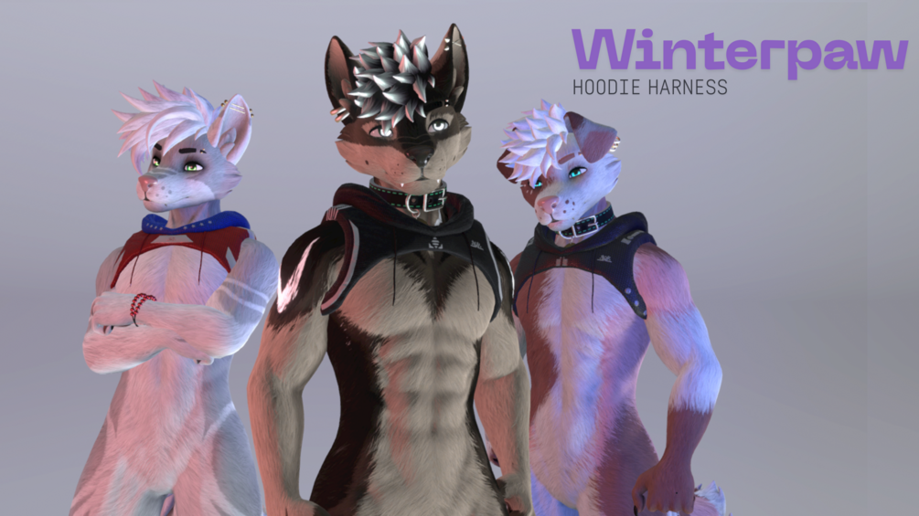 Harness that has a Hoodie attachment! Hood does not come up over head, tassels are dynamic and wiggle around, has blendshapes to fit around most clothing for the Winterpaw including a few other popular clothing items out there, including most of AviWorks items.